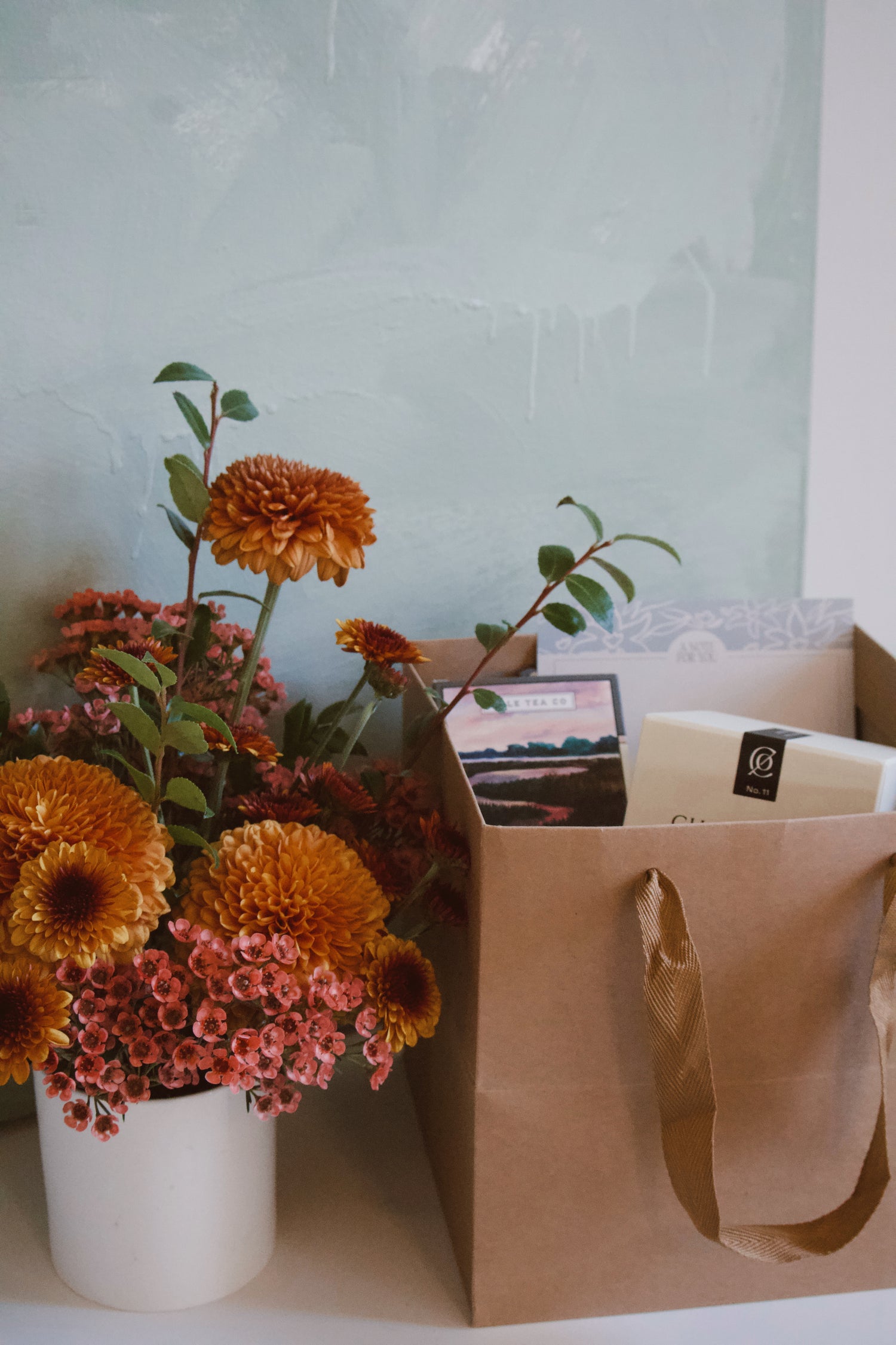 a seasonal floral arrangement, candle of choice, choice of organic tea and a fun seasonal addition - in the Autumn season it's a simmer pot kit! We will design a beautiful floral arrangement in a vase. We will include our seasonal candle, Palmetto Pumpkin & then you will choose from our selection of Hale Teas.